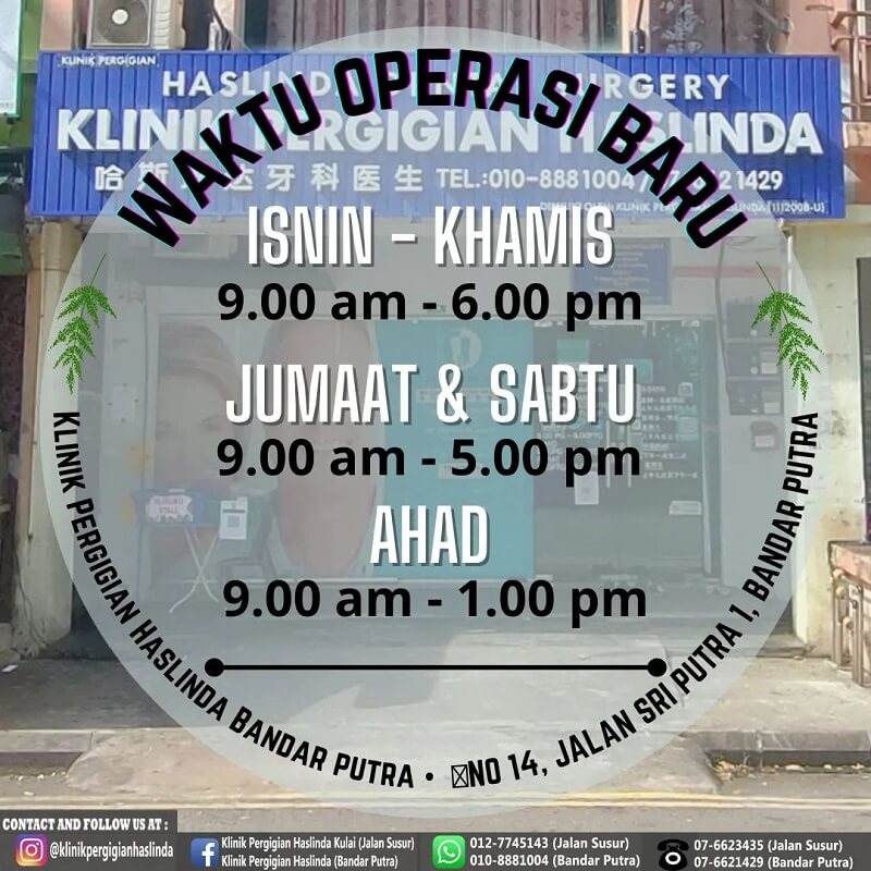 Di tengah-tengah pertumbuhan pesat Bandar Putra, Kulai, Klinik Pergigian Haslinda muncul sebagai destinasi pilihan untuk perkhidmatan pergigian pediatrik yang berkualiti dan mesra keluarga. Dikenali dengan pendekatan lembut dan persekitaran yang selesa, klinik ini memberi tumpuan khusus kepada kesihatan gigi kanak-kanak, membantu mereka memulakan rutin penjagaan gigi seawal usia kecil dengan keyakinan dan tanpa rasa takut. Dengan lokasinya yang strategik dan pasukan pakar yang berpengalaman dalam pergigian pediatrik, Klinik Pergigian Haslinda menjadi pilihan terbaik untuk ibu bapa yang mencari rawatan gigi yang kompeten dan mesra untuk anak-anak mereka berdekatan kawasan mereka.